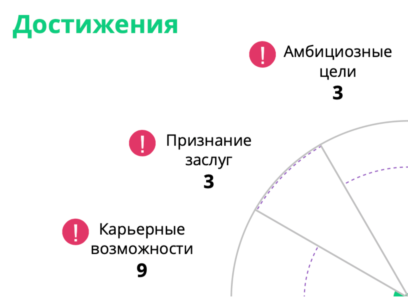 Хочу продолжить тему предыдущего письма и поговорить о присвоении себе результатов. Примерно 6 месяцев назад я стала использовать в своей практике тесты FADE, PiF, Герчикова и деструкторы. В комплексе они составляют хорошую базу для стартового разговора с человеком о его движении, развитии, целях и дефицитах. Ниже вы можете увидеть часть диаграммы теста FADE (тест на выгорание и профессиональную удовлетворенность), где для человека важны достижения, но он на них не опирается (важность — пунктирная линия, количество зеленой заливки — удовлетворенность этой потребности). После консультации стало ясно, что этот старший менеджер весьма результативен и регулярно получает не только позитивную обратную связь, но и повышенные премии. При этом внутренне признания этих результатов нет. Нет чувства, что это значимо по его меркам, ощущениям. Несмотря на то, что есть признание извне, опираться на такой профиль удовлетворенности практически невозможно. Можно даже с таким профилем согласиться на управленческую должность, но удовлетворения там не получить.
