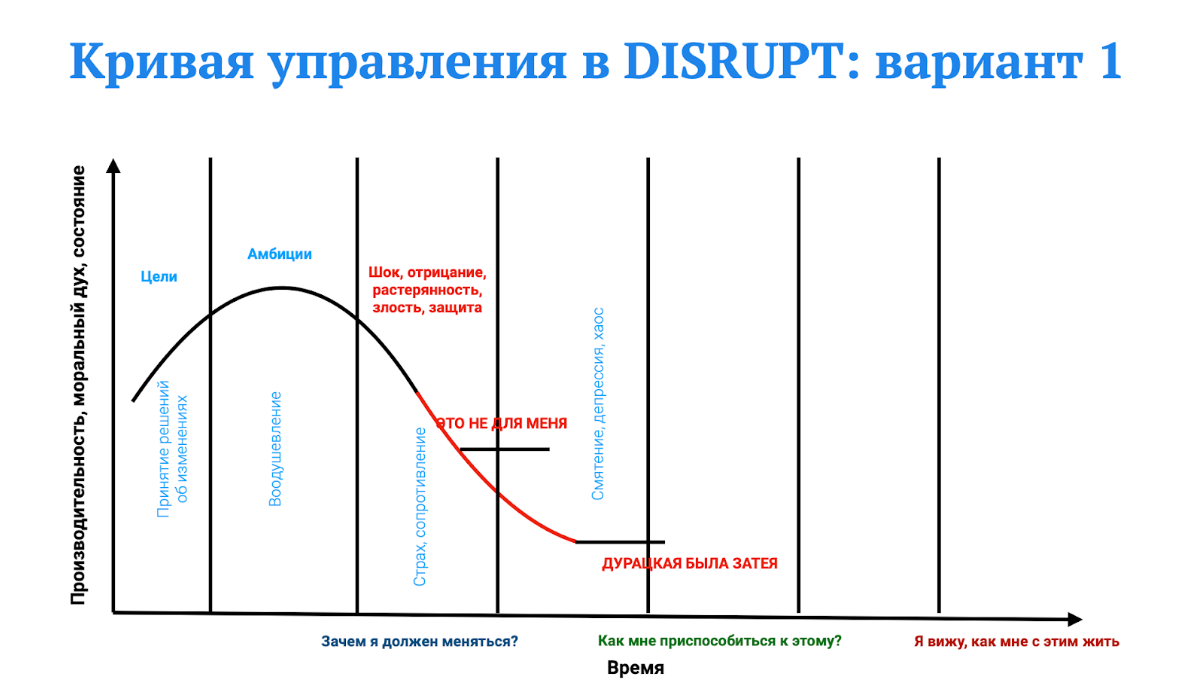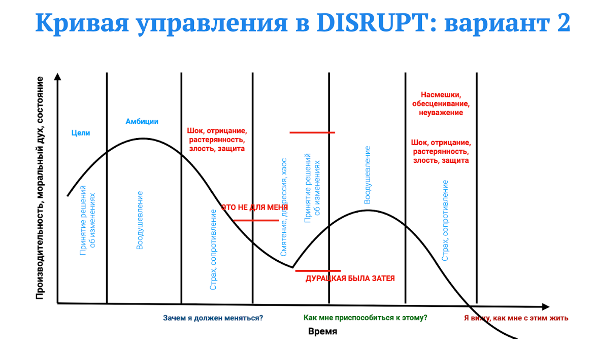 Пессимизм, как состояние команды, начинает играть значительную роль в восприятии происходящего: сотрудники начинают многое анализировать через эту призму. В такие моменты может поступить критическая масса информации, указывающая на то, что выбранный путь оказался неверным. Например, если минимально жизнеспособный продукт (MVP) не сработал, руководителю предстоит сложная задача принятия решения о возможном закрытии проекта (“неверная была идея” на кривой изменений - как раз про смерть проекта или продукта).