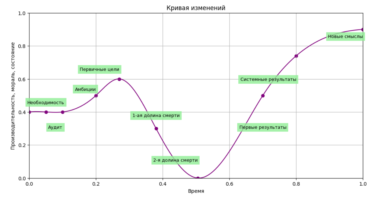 Динамическое целеполагание не отменяет долгосрочные или четко-прописанные цели, но делает дополнительный акцент на том, что является результатом внедрения изменений. В текущем мире принято считать, что результат работы компании - это линейное движение вверх по финансовым и другим показателям. Мы в рамках нашей методики показываем, что команда, достигнув указанных на старте целей, может быть по итогу разочарована результатом и не присвоит его в качестве важного опорного смысла. Мы формулируем гипотезу о том, что важными опорными смыслами в процессе внедрения изменения являются возможность испытать контакт с собственными любопытством (граничащим с состоянием потока), образом будущего себя, чувства актуальности происходящему моменту (наступающей адаптации к новой реальности), сопричастности чему-то большему, чем свои индивидуальные цели (чувство плеча, сплоченного коллектива, ощущение принадлежности чему-то важному), а также возможность усилить свою жизнестойкость (путем развития своего мышления - сделанных выводов о себе, мире по итогу внедрения изменений) и повлиять на жизнестойкость команды или компании. В рамках динамического целеполагания первичная цель может быть до конца не выяснена на старте внедрения изменений, но может быть сформирован некоторый образ позитивного будущего себя, либо образ компании, в который руководитель готов инвестировать. Компания или конкретный проект могут выступать в качестве инструментов для достижения образа себя будущего. В рамках динамического целеполагания мы внимательно относимся к состоянию команды, проводя аудит перед запуском серьезных изменений. Чем сложнее пул задач в рамках обновления системы, тем важнее понимать, какой ресурс является опорным. В рамках динамического целеполагания мы придерживаемся мнения, что многие инструменты, например, классические стратегические сессии, устарели как формат и не являются продвигающими, развивающими как для руководителя, так и для команды. Скорее, текущий формат, предполагающий раз в год сформулировать планы и цели (исходя из предыдущей логики и результатов) , по завершению формирует больше тревоги, ощущения беспомощности, нежели дарит спокойствие и чувство опорности. В данных письмах мы рассмотрим альтернативный подход к целеполаганию, где фокус смещается на фазу “аудита” и “амбиций”. Подход в целеполагании меняется: от редких встреч с требованием сформулировать цели по SMART к регулярным рабочим сессиям, воркшопам и встречам, на которых команды могут использовать в том числе инструменты психоаналитического формата для задач с большим количеством неизвестных. Это приводит к тому, что целеполагание становится частью жизни, а не изолированным событием с использованием только предыдущих логик и подходов. Динамические цели могут быть отделены от целей, которые идут в режиме SMART, так как ресурс, который требуется на них, другой и требует другого подхода. Руководителю, постоянно работающему в рамках динамического целеполагания, могут потребоваться цели SMART для стабилизации состояния и ощущения опорности. Изменения в целеполагании должны включать в себя стартовые, понятные цели, которые ясны как руководителю, так и его команде. Постоянная работа над динамикой без видимых результатов приводит к фрустрации и чувству неуспеха, 