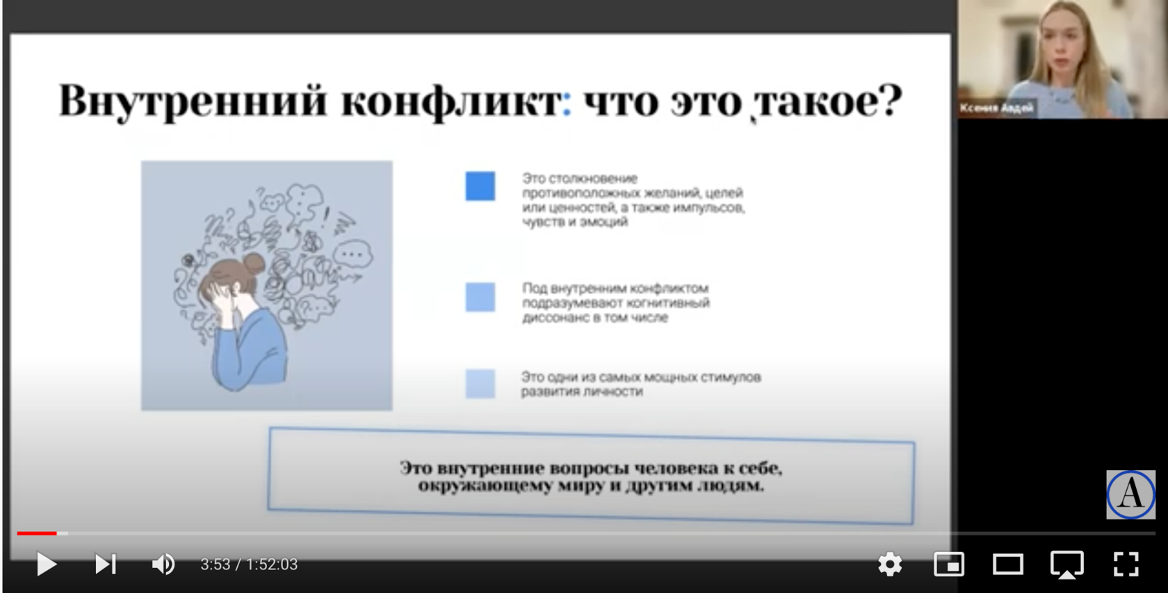 | Привет! Спасибо, что решили изучить вебинар "Как внутренние конфликты мешают выстраивать развивающее окружение". | | | | Этот вебинар мы проводим в поддержку курса "Как решать возникающие конфликты с результатом для обеих сторон?" | | | На курсе будем объяснять: - Как увеличивается коммуникационная нагрузка в текущей реальности и почему конфликты стали ежедневным спутником человека