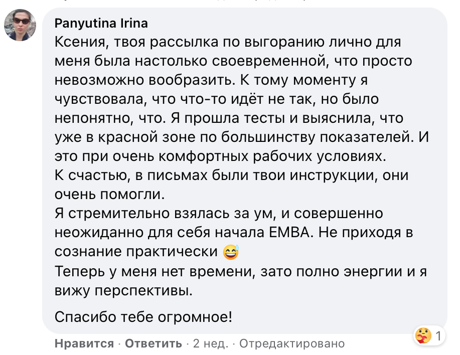 Я не останавливала рабочий процесс, а даже повышала планку по задачам. И обошлась без таблеток. Спустя семь месяцев тесты показали, что выгорания и преддепрессивного состояния больше нет. Возможно, я «ошибка выжившего», но я показала, что возможно и так».
